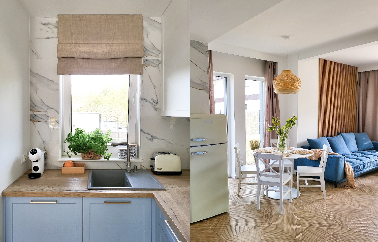 Salon połączony jest z jadalnią oraz aneksem kuchennym. Razem zaaranżowane są jako duża otwarta przestrzeń. Znajduje się w nim wygodna trzyosobowa kanapa z funkcją spania (powierzchnia spania 150x200cm), duża pufa-podnóżek oraz stolik kawowy. Do dyspozycji także Smart TV 55cali z telewizją kablową i AndroidTV (Netflix, Player itd) połączony z Soundbarem. Dodatkowe szuflady w szafce pod TV i pod schodami zapewnią mnóstwo miejsca do przechowywania codziennych przedmiotów lub rzeczy osobistych osób nocujących na parterze. Duże okno przesuwane typu HS, prowadzące na taras i do ogrodu. Na wejściu duża zabudowana szafa z półkami i wieszakami. Przytulny kącik dla najmłodszych pod schodami z gniazdkiem i lampką na miłe czytanie książeczek lub zabawy. Parter dopełnia piękna błękitna ściana z ukrytymi drzwiami do toalety.